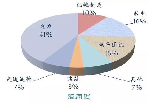 銅是被廣泛應(yīng)用在電力、家電、機械、建筑、交通、電子通訊等領(lǐng)域。2014年中國銅儲量3000萬噸,產(chǎn)量162萬噸,消費1135萬噸。