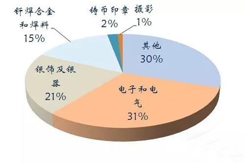 銀主要應(yīng)用于工業(yè)、醫(yī)學(xué)、首飾3個方面。我國銀的主要用于電子電器工業(yè)、焊接合金以及首飾加工等。2014年中國銀儲量4.3萬噸,產(chǎn)量4200噸。