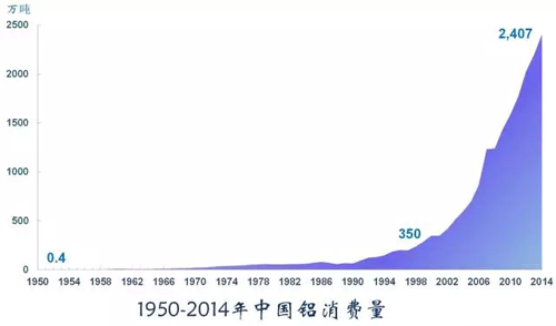 鋁是全球消費量最大的有色金屬,是目前應(yīng)用十分廣泛的最經(jīng)濟適用的原材料之一。中國鋁消費持續(xù)穩(wěn)定增長,2014年的消費量是2000年消費量的7倍,是1950年的3400多倍。