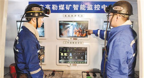 在山東能源淄礦集團巴彥高勒煤礦綜采工作面智能化集控中心,6臺防爆電腦清晰顯示著工作面所有支架的壓力及狀態(tài)、采煤機的運行參數(shù)、煤壁及支架視頻影像。它與地面集控中心的顯示器相連,可以在地面控制井下300米長工作面上的所有設(shè)備。職工“礦三代”趙昌圣點動鼠標,屏幕中采煤機滾筒迅速打開噴霧,連接運輸機的順槽皮帶輸送機也隨之運轉(zhuǎn)起來,隨著采煤機的推進,滾滾“烏金”順著順槽皮帶經(jīng)主井提升到地面。